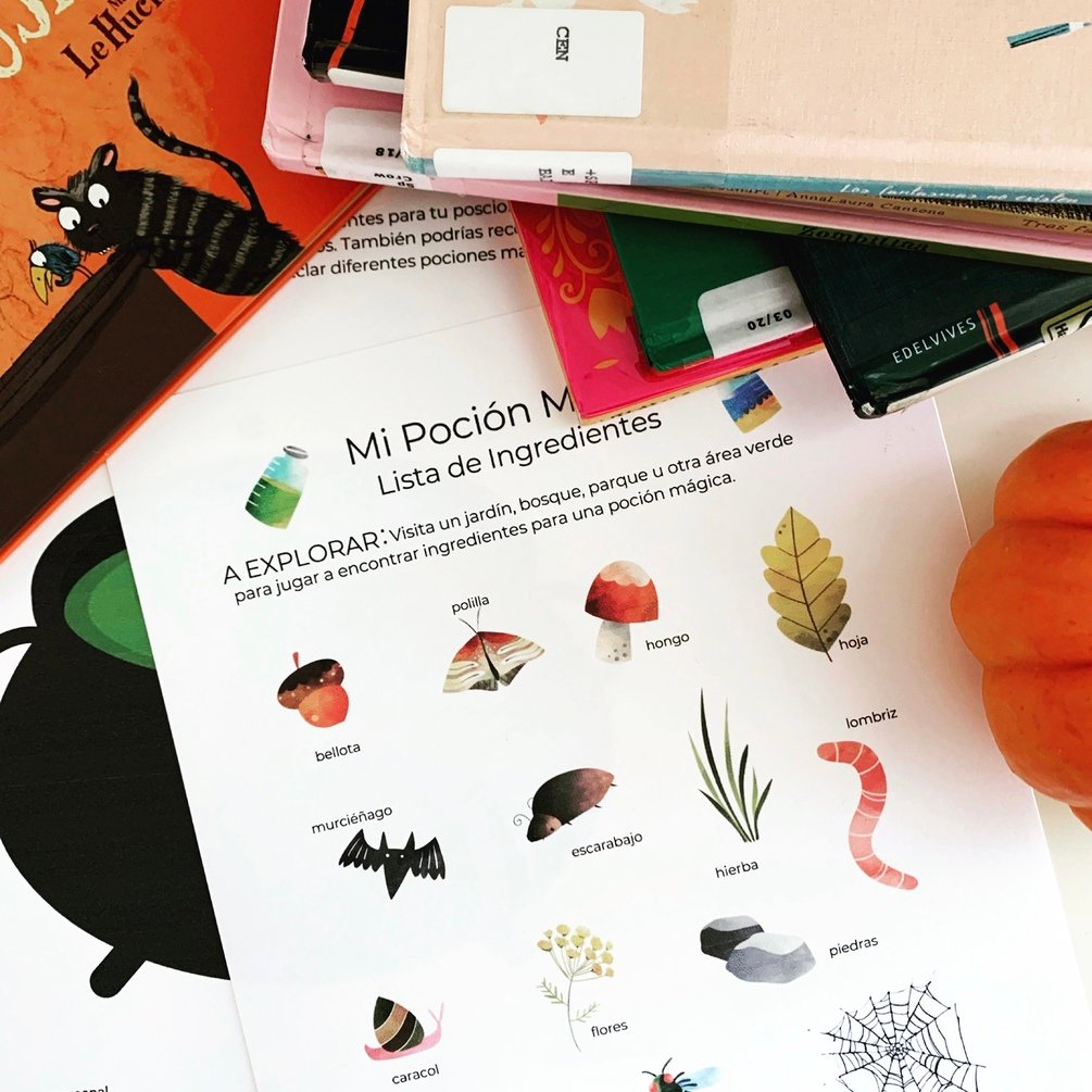 Busquen los animales y plantas en la lista para después imaginar y jugar a mezclarlos al crear pociones mágicas.